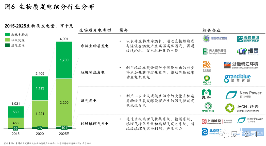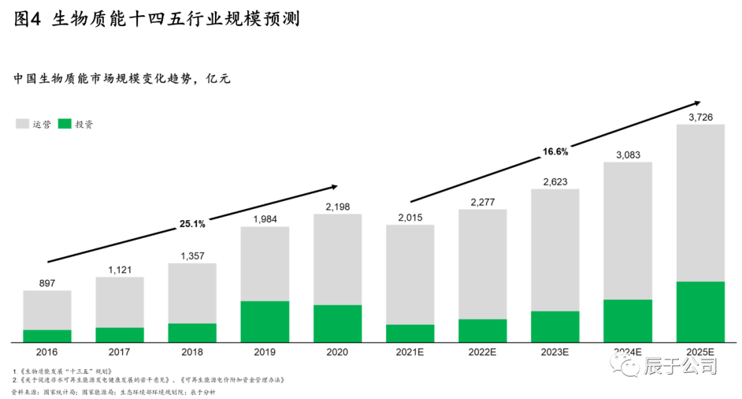辰于預(yù)測(cè),隨著“30·60”雙碳目標(biāo)引導(dǎo)下的能源革命和能源轉(zhuǎn)型,以及相關(guān)政策支持(例如明確對(duì)存量、增量的生物質(zhì)發(fā)電項(xiàng)目將按照新增不欠的原則由國家繼續(xù)給予電價(jià)補(bǔ)貼,并鼓勵(lì)金融機(jī)構(gòu)按照市場(chǎng)化原則對(duì)列入補(bǔ)助項(xiàng)目清單的企業(yè)予以支持),生物質(zhì)能市場(chǎng)“十四五”期間的投資和運(yùn)營規(guī)模將持續(xù)提升,復(fù)合增長(zhǎng)率16.6%,到2025年達(dá)到3700億元規(guī)模(見圖4)。投資方面,預(yù)計(jì)生物天然氣投資額最高,增長(zhǎng)也最快;運(yùn)營方面,生物質(zhì)發(fā)電占比最高,但生物天然氣的增速最快。