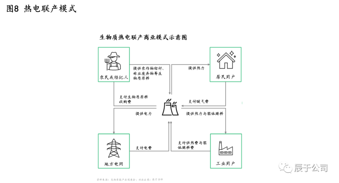 盈利壓力一方面將促進(jìn)行業(yè)洗牌,在優(yōu)勝劣汰的過程中預(yù)計(jì)行業(yè)集中度將逐步提升,民營企業(yè)的份額會(huì)逐步降低;另一方面,行業(yè)也在積極探索新的商業(yè)模式,提升項(xiàng)目盈利性,其中熱電聯(lián)產(chǎn)是主要的方向(見圖8)。相比單純發(fā)電賣錢,熱電聯(lián)產(chǎn)在發(fā)電過程中產(chǎn)生的剩余熱量也通過向居民或工業(yè)用戶供熱的方式來獲取收入,能量利用率得到提升,經(jīng)濟(jì)效益和社會(huì)效益都更好。