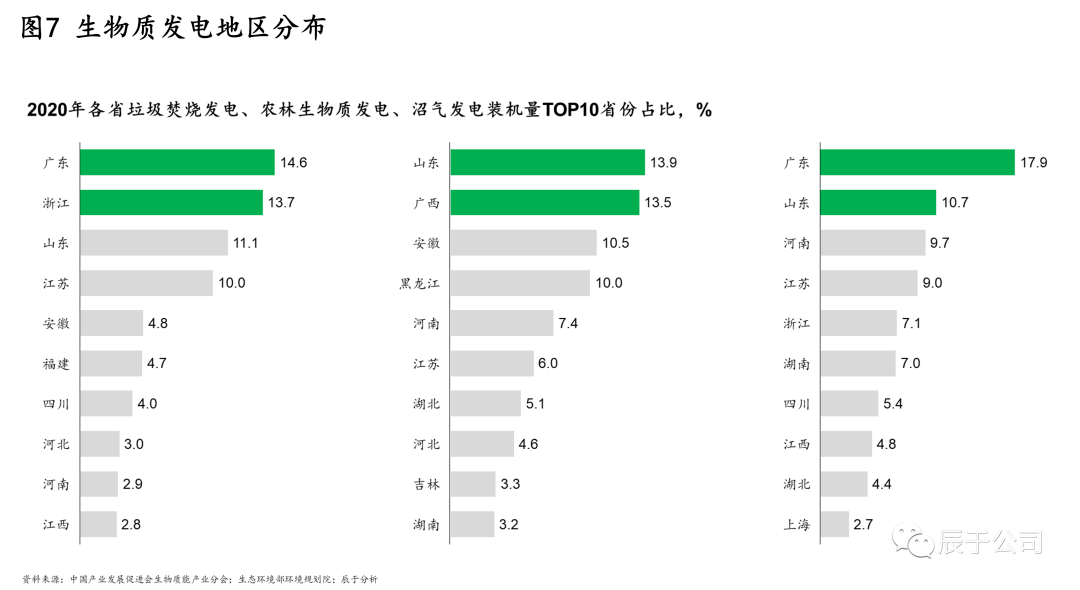 在地區(qū)分布上,各類型的生物質(zhì)發(fā)電集中于華東華南地區(qū),但各地區(qū)側(cè)重點(diǎn)有所不同。截至2020年底,垃圾焚燒發(fā)電集中在廣東省、浙江省、山東省、江蘇省、安徽省等地區(qū),合計(jì)占全國累計(jì)裝機(jī)容量的54%;農(nóng)林生物質(zhì)發(fā)電主要集中于山東省、湖北省、安徽省、黑龍江省、河南省,合計(jì)占比達(dá)到55.3%;沼氣發(fā)電主要集中于廣東省、山東省、河南省、江蘇省、浙江省,合計(jì)占比達(dá)到54.3%(見圖7)。