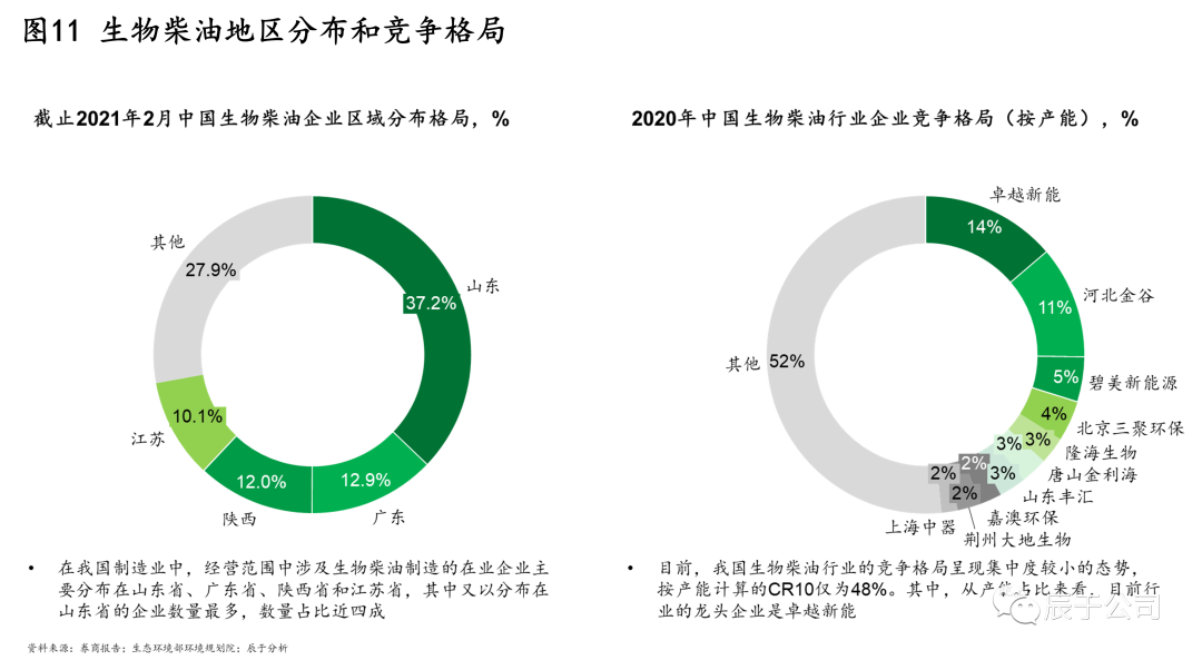 在銷售應(yīng)用上,國內(nèi)的主要渠道是出口、交通燃料、化工等,出口是拉動(dòng)行業(yè)發(fā)展的主要渠道,2019年出口占產(chǎn)量的比例達(dá)到80%。國內(nèi)需求的打開是行業(yè)發(fā)展的最大希冀,其中最有望打開的市場(chǎng)是交通燃料領(lǐng)域——生物柴油強(qiáng)制添加政策。部分城市已經(jīng)開始在試點(diǎn),上海市2013年開始在公交車上實(shí)行B5標(biāo)準(zhǔn)(添加比例5%)?,F(xiàn)在國家已開始全國范圍進(jìn)行B5 強(qiáng)制添加標(biāo)準(zhǔn)的意見征求,并有望隨著雙碳目標(biāo)深入推進(jìn)提升到B10。若政策落地實(shí)施,將產(chǎn)生450萬噸~1000萬噸的產(chǎn)能缺口。