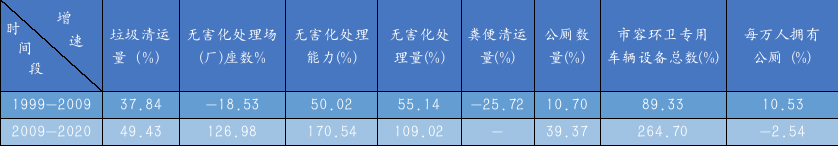 從上述統(tǒng)計(jì)看。截至1989年,全國只有37座生活垃圾無害化處理場(廠),雖然較1979年的12座翻了幾番,但與1999年數(shù)據(jù)相比,堪稱一窮二白,為避免數(shù)值失真,筆者在計(jì)算各指標(biāo)增速時(shí)僅從1999年開始,大致以每十年為一個(gè)跨度來計(jì)算,統(tǒng)計(jì)結(jié)果如表2所示。表2 1999-2020年全國市容環(huán)衛(wèi)行業(yè)各指標(biāo)增速