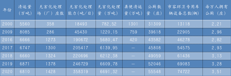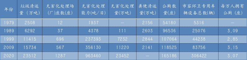 《年鑒》分別統(tǒng)計(jì)了城市、縣城和村鎮(zhèn)三部分市容環(huán)衛(wèi)大數(shù)據(jù),其中城市部分最為詳盡,包括了從1979-2020年的生活垃圾清運(yùn)量、垃圾處理場(廠)數(shù)量、無害化處理能力、無害化處理量、糞便清運(yùn)量、市容環(huán)衛(wèi)專用車輛設(shè)備總數(shù)、公廁數(shù)量及每萬人擁有公廁數(shù)(個(gè)別年份和統(tǒng)計(jì)項(xiàng)目空缺);縣城部分也包括上述統(tǒng)計(jì)項(xiàng)目,但日期是從2000年開始至2020年;村鎮(zhèn)部分則只有2020年數(shù)據(jù),統(tǒng)計(jì)項(xiàng)目只包含生活垃圾中轉(zhuǎn)站數(shù)量、環(huán)衛(wèi)專用車輛設(shè)備總數(shù)和公廁數(shù)量。《年鑒》顯示,2020年,全國城市生活垃圾清運(yùn)量達(dá)23,512萬噸(約2.351億噸),總計(jì)擁有1287座無害化處理場(廠),生活垃圾處理能力963,460.15噸/日(約96.35萬噸/日),年無害化處理生活垃圾23,452萬噸(約2.345億噸)。全國城市擁有165,186座(約16.52萬座)公廁,平均每萬人擁有3.07座公廁,全國城市共擁有環(huán)衛(wèi)專用車輛設(shè)備306,422輛(約30.64萬輛)。表1 1979-2020年全國城市市容環(huán)衛(wèi)總體情況(大致按年代跨度)