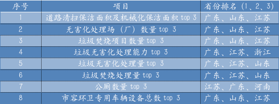 2、2020年環(huán)衛(wèi)設(shè)施投資大提速2020年市容環(huán)衛(wèi)和垃圾處理基礎(chǔ)設(shè)施固定資產(chǎn)投資1568.4億元,其中市容環(huán)衛(wèi)投資862.6億元,垃圾處理設(shè)施投資705.8億元,這兩個(gè)數(shù)字較2019年增長了54.75%和73.50%,目測是10年來增速最快的一年。環(huán)衛(wèi)真的是朝陽產(chǎn)業(yè)?。?/span>3、有的省在環(huán)衛(wèi)和垃圾處理固定資產(chǎn)投資為0上文提到固定資產(chǎn)投資,全國花了1568個(gè)億,但也有個(gè)別省份交了白卷,例如西藏,在這兩方面的投資均為0,而青海,雖然在市容環(huán)衛(wèi)設(shè)施方面花了1個(gè)多億,但垃圾處理基礎(chǔ)設(shè)施投資也是0.有0就有top 5,2020年,在市容環(huán)衛(wèi)設(shè)施方面投資最大的省份是:廣東(102.2億)、江蘇(93.5億)、浙江(61.4億)、河南(59.4億)、河北(57.1億),垃圾處理設(shè)施建設(shè)方面投資最大的省份是:廣東(97.3億)、江蘇(84.6億)、浙江(53.8億)、河北(49.7億)、河南(48.3億)。是的,你沒看錯(cuò),前三沒有變化,只有第四和第五位是河南、河北在移形換位。如果沒有特殊情況,未來幾年內(nèi),這五個(gè)省的環(huán)衛(wèi)和垃圾處理設(shè)施投資會繼續(xù)名列前茅,相關(guān)企業(yè)需要重視了!4、全國市容環(huán)衛(wèi)實(shí)力哪家強(qiáng)?表5 全國市容環(huán)衛(wèi)行業(yè)主要指標(biāo)排名前三位省份