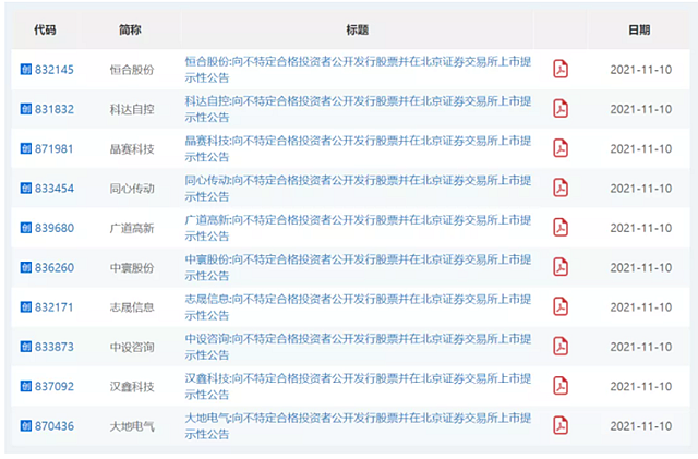 11月10日晚間,10家新三板精選層企業(yè)披露《向不特定合格投資者公開發(fā)行股票并在北京證券交易所上市提示性公告》,均表示經北交所同意,公司股票將于11月15日在北交所上市。