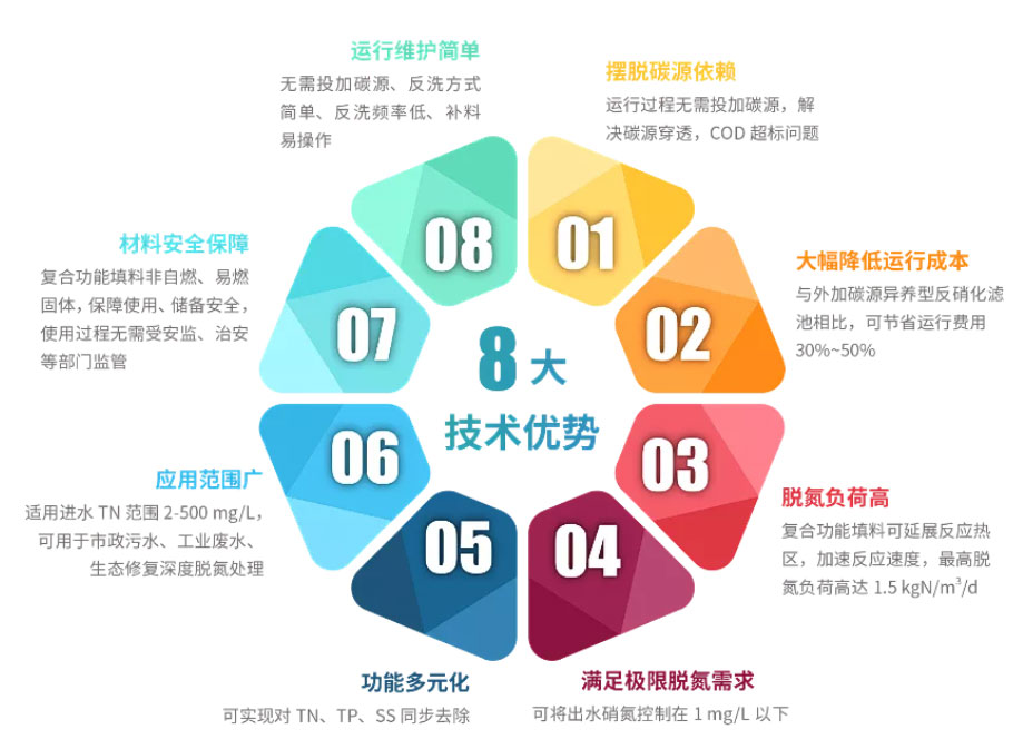 而通過對復(fù)合活性生物載體中硫、鐵及其他活性組分進(jìn)行優(yōu)化設(shè)計(jì),則能促使附著其上的功能微生物形成代謝偶聯(lián)網(wǎng)絡(luò),實(shí)現(xiàn)高生物持有量、長距離電子傳遞,進(jìn)而獲得高負(fù)荷脫氮能力,徹底擺脫對碳的依賴。▼SADeN®技術(shù)8大核心優(yōu)勢