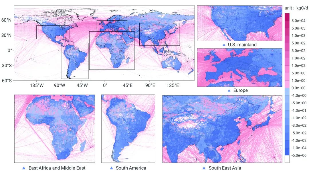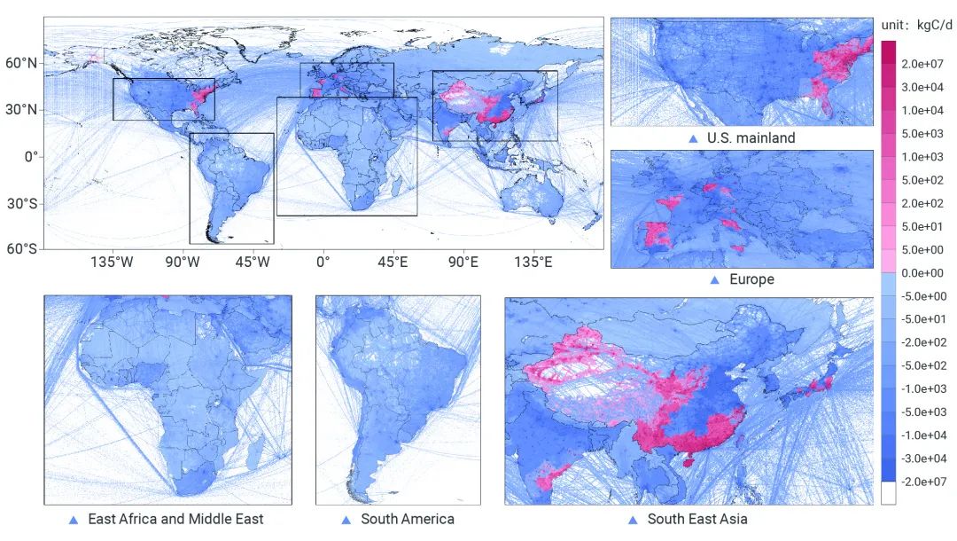 近實時全球碳地圖反映出人類活動變化導(dǎo)致的碳排放時空動態(tài)變化特征,包括氣候、季節(jié)、節(jié)假日甚至是新冠疫情對碳排放的實時動態(tài)變化。