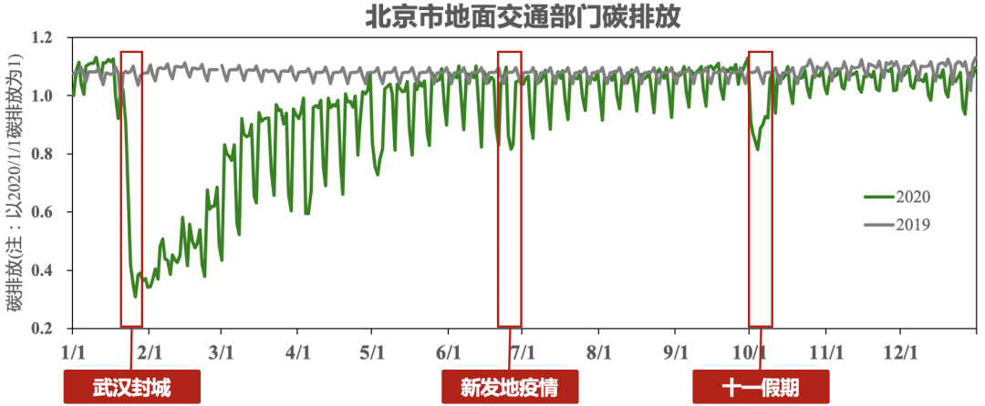 GRACED可精準(zhǔn)捕捉城市等精細空間尺度下,碳排放受疫情、節(jié)假日等影響的分部門動態(tài)變化。以北京為例,GRACED精準(zhǔn)捕捉到北京市地面交通部門在2020年1月底受疫情影響的碳排放下降顯著;2020年6月底,因北京新發(fā)地疫情的爆發(fā)碳排放也有所下降;2020年10月初,因十一假期北京市市民外出旅游,市內(nèi)交通碳排放量出現(xiàn)明顯下降(圖8)。