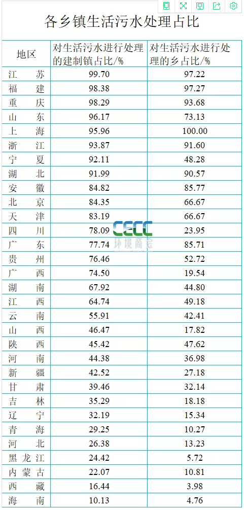 分省市來看,江蘇、福建、重慶、上海、浙江、湖北等6個省市90%以上鄉(xiāng)鎮(zhèn)生活污水實現(xiàn)處理,其他省市有不同程度缺口,具體如下: