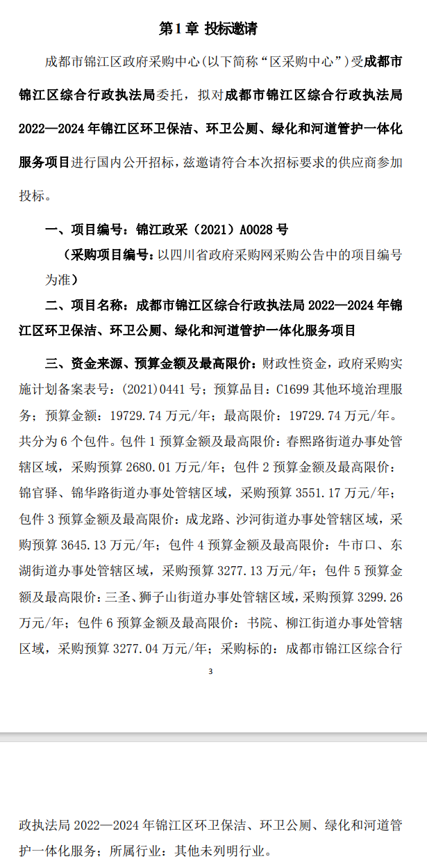 四川省公共資源交易網(wǎng)公布《成都市錦江區(qū)綜合行政執(zhí)法局2022—2024年錦江區(qū)環(huán)衛(wèi)保潔、環(huán)衛(wèi)公廁、綠化和河道管護一體化服務(wù)項目公開招標(biāo)公告》。