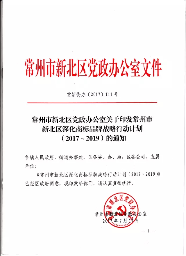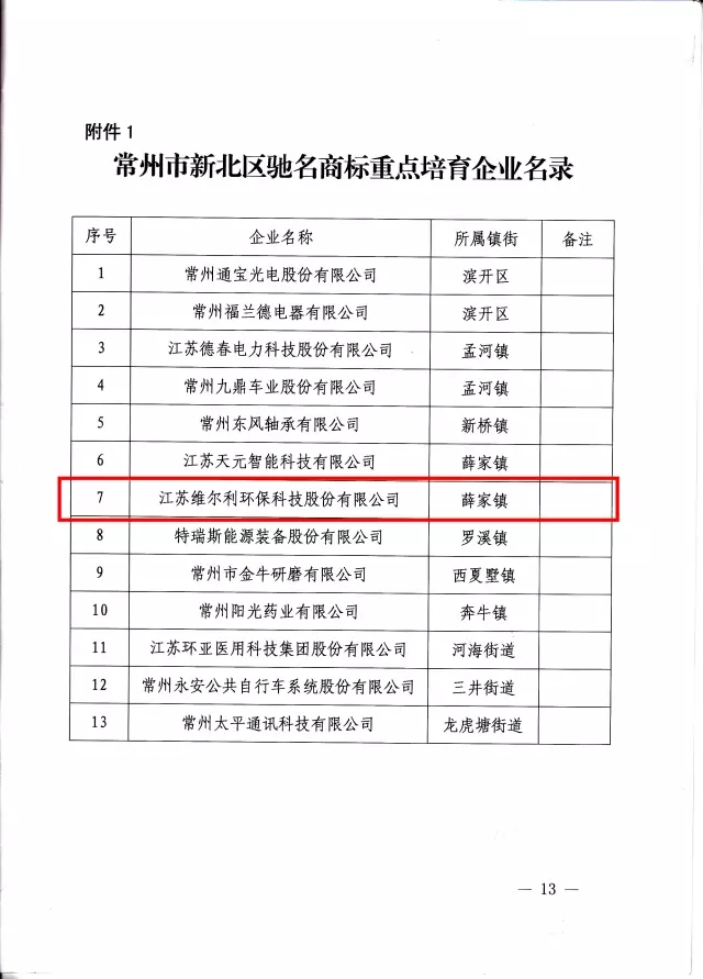 在《常州市新北區(qū)黨政辦公室關(guān)于印發(fā)常州市新北區(qū)深化商標(biāo)品牌戰(zhàn)略行動(dòng)計(jì)劃(2017-2019)的通知》(常新委辦〔2017〕111號(hào))文件中,提出深化商標(biāo)品牌戰(zhàn)略建設(shè),將維爾利環(huán)保作為常州市新北區(qū)馳名商標(biāo)重點(diǎn)培育企業(yè),實(shí)施“產(chǎn)業(yè)品牌提升”工程,打響產(chǎn)業(yè)品牌特色優(yōu)勢(shì),培育細(xì)分行業(yè)新品牌。