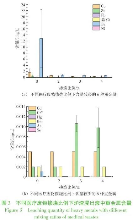 圖3(a)表示了不同比例摻雜醫(yī)療廢物爐渣含量較多的重金屬浸出情況,可見醫(yī)療廢物的摻入對Cu和Ba的浸出影響較為明顯,隨著醫(yī)療廢物摻入比例的增加,Cu的浸出量明顯降低,從1.6 mg/L降低到0.33 mg/L。Ba浸出量降低的趨勢更加明顯,從12.82 mg/L降低到0.64~0.89 mg/L,這是由于生活垃圾成分復雜,分類不夠徹底時,部分灰土、玻璃、磚瓦陶瓷、金屬類垃圾等成分會嚴重影響爐渣中的Ba元素含量,但是醫(yī)療廢物中并不存在這些組分,因此Ba的浸出濃度降低明顯。摻燒醫(yī)療廢物后爐渣中Zn的含量與原爐渣比也有所降低,但不同醫(yī)廢摻燒比例下的Zn含量變化不大,在0.1~0.2 mg/L范圍波動。Long等研究了中國城市垃圾中重金屬的分布,指出廚余、灰渣、塑料以及紙張占垃圾總量的55.1%~99.5%,并且這幾種垃圾組分中的Cu及Zn含量分別占垃圾總量的 76.3%和 82.3%。醫(yī)療廢物這些組分相對較少,所以Cu和Zn的含量略有降低。摻入醫(yī)療廢物混燒后,其他重金屬浸出濃度相對較少,并無明顯變化。爐渣中含量較多的重金屬,含量高低依次為:Ba>Zn>Cu。但是其浸出濃度遠遠低于GB 5085.3—2007危險廢物鑒別標準 浸出毒性鑒別的限值。