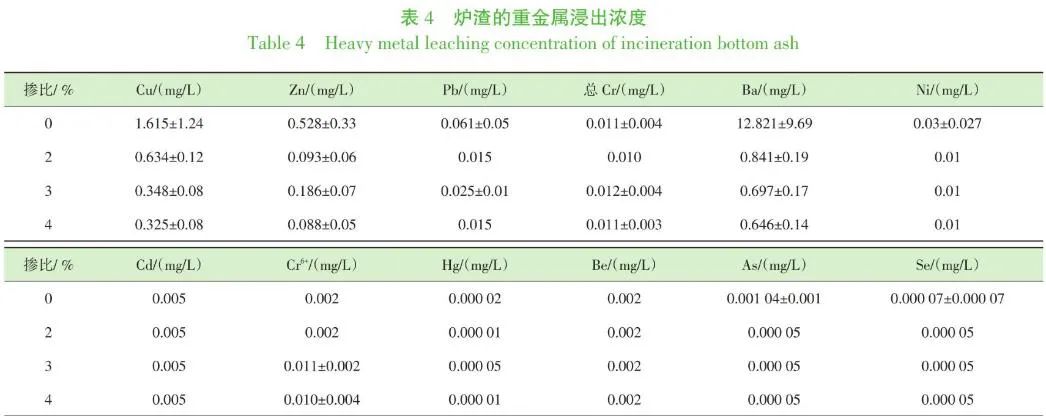 圖3(b) 顯示了爐渣中浸出濃度較少的6種重金屬,未檢出的重金屬含量在統(tǒng)計時按檢出限的 1/2進行處理,除了Cr6+之外,生活垃圾摻入醫(yī)療廢物摻燒后爐渣重金屬含量少且變化基本不大,部分尚未達到檢出限。根據(jù)醫(yī)療廢物焚燒處理的要求,一般將醫(yī)療廢物分為含氯塑料、非含氯塑料、橡膠、織物、紙類、棉竹、玻璃、金屬及其他9類。塑料可以使醫(yī)療廢物具有較高的熱值,便于焚燒爐的焚燒處理。醫(yī)療廢物摻入比例較少時Cr6+含量基本不變,隨著醫(yī)療廢物摻入比例的增加,Cr6+的浸出濃度有所提高,這一方面是因為Cr6+可能由醫(yī)療廢物帶入,另一方面醫(yī)療廢物的高熱值有利于促進焚燒完全進行,同時醫(yī)療廢物摻燒量對焚燒爐運行工況的影響小節(jié)中所述的通風量上升引起氧化性氣氛加強,在氧氣供應(yīng)充足的條件下促進了Cr的氧化,爐渣中Cr6+濃度可能有所增加。 生活垃圾焚燒爐渣中重金屬的含量波動很大,關(guān)于醫(yī)療廢物單獨焚燒爐渣中重金屬的零星研究顯示,醫(yī)療廢物焚燒爐渣的重金屬含量在垃圾焚燒底渣的含量范圍之內(nèi)。圖3和表4顯示醫(yī)療廢物摻燒后爐渣的重金屬浸出濃度處于其他焚燒廠僅焚燒生活垃圾獲得的爐渣重金屬浸出濃度范圍內(nèi)。顯著性分析表明:不同比例的醫(yī)療廢物摻燒后主要對于生活垃圾焚燒爐渣中重金屬Cu、Zn、Pb、Ba、Cr6+和As的浸出濃度有影響,對于其他重金屬的浸出并無明顯影響;而且除Cr6+外其他重金屬浸出濃度反而下降。對于Cr6+,摻燒比為2%時與未摻燒無顯著性差異,摻燒比增加到3%和4%時,Cr6+的浸出濃度雖然上升,但是也遠遠低于限值5 mg/L。故摻燒醫(yī)療廢物對生活垃圾焚燒爐渣重金屬浸出特性總體上沒有顯著的影響。