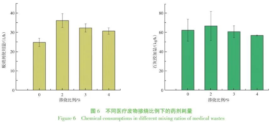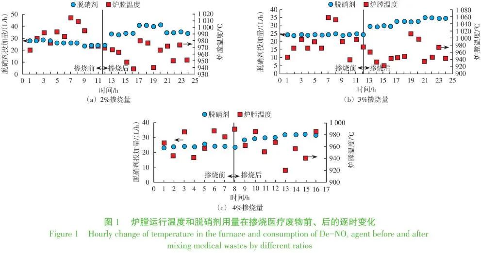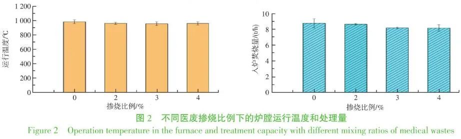 這里主要關(guān)注醫(yī)療廢物摻燒對焚燒爐爐膛溫度和焚燒處理量的影響。圖1給出每個摻燒比例前后的爐膛溫度和脫硝劑用量的逐時變化。其中摻燒比例為2%和3%(wt)時,前12 h為日常運行情況,后12 h為摻燒后的代表性工況;摻燒比例為4%(wt)時,前8 h為日常運行情況,后8 h為摻燒后的代表性工況。將上述逐時溫度按照不同醫(yī)療廢物添加量工況取平均值,結(jié)果見圖2,圖2同時給出了實際的入爐垃圾焚燒量??梢?,日常運行爐膛內(nèi)溫度較高,平均可達982.72 ℃,在摻燒醫(yī)療廢物后爐膛溫度略有降低,這可能是由于供風量隨著醫(yī)療廢物摻燒比例的增加而增大引起的變化,但是不同摻燒比例下運行溫度變化不大,無顯著性差異,總體上運行溫度在正常波動范圍內(nèi),并高于850 ℃。
