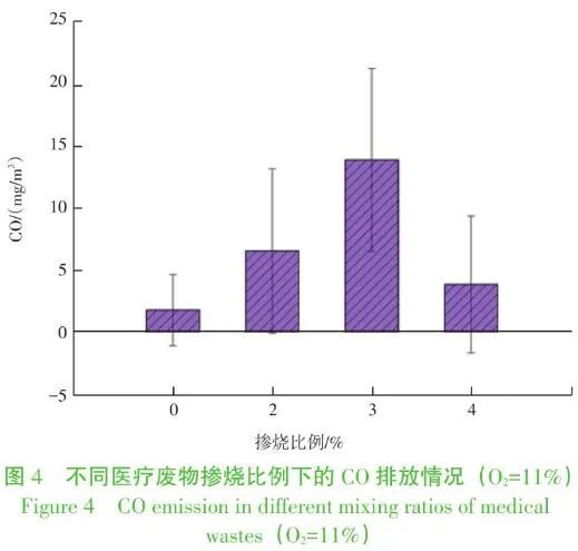 爐渣主要用于建筑材料,摻燒4%及以下的醫(yī)療廢物,從重金屬的浸出來看基本上不影響其用途。因此巴塞爾公約也推薦醫(yī)療廢物可在生活垃圾焚燒爐中應(yīng)急處置。 不同醫(yī)療廢物摻燒比例下CO排放情況見圖4。