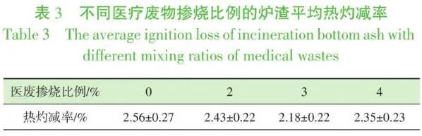 如表3所示,日常焚燒生活垃圾爐渣平均熱灼減率為2.56%,而摻燒醫(yī)療廢物的爐渣范圍是2.18%~2.43%,較原爐渣略有下降,這是因為醫(yī)療廢物熱值較高,可促進爐渣中的碳燃盡。