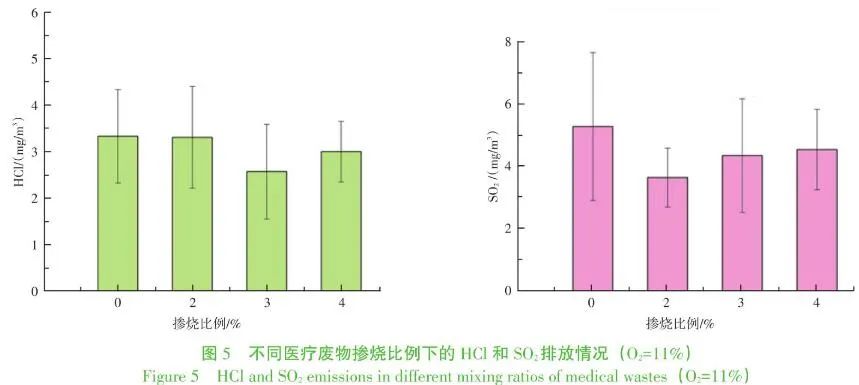 圖5顯示,日常運行生活垃圾焚燒煙氣中SO2濃度本身有所波動,但是水平很低,平均含量為5.27 mg/m3,遠低于排放限值。摻燒醫(yī)療廢物后,與HCl相比,盡管變化規(guī)律不完全一致,但是也呈現(xiàn)降低趨勢,作為酸性氣體,其變化原因與HCl類似。