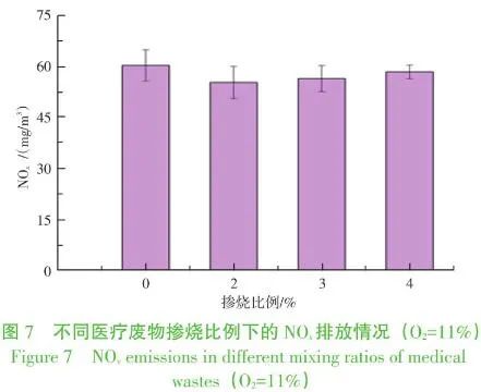 圖7顯示日常運行焚燒煙氣中NOx排放量為60.18 mg/m3,完全滿足排放標準。在摻燒醫(yī)療廢物后NOx的含量總體上有微幅降低。其中2%摻燒比例降低明顯,為55.18 mg/m3,降低了8.3%,這主要因為此時系統(tǒng)的脫硝劑用量最大,見圖6。顯著性分析顯示,醫(yī)療廢物的摻燒對NOx排放影響不大,數(shù)據(jù)無顯著性差異,這是因為NOx的濃度與脫硝藥劑消耗量及溫度有對應(yīng)關(guān)系,一方面圖2顯示摻燒后爐膛溫度有微弱下降,另一方面圖6顯示煙氣脫硝劑的消耗量有所增加,最終使得NOx排放水平基本穩(wěn)定。