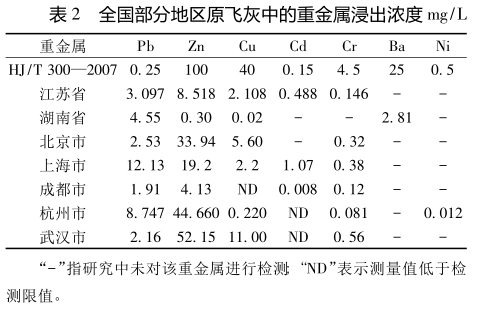 飛灰一般呈灰白色或深灰色,顆粒細(xì)小(粒徑分布通常在1-150μm之間),比表面積大(3-18m2/g),具有吸濕性和飛揚(yáng)性。飛灰的組成成分主要有CaO、SiO2、Al2O3、Na2O、K2O等氧化物,還有一些重金屬的氯化物,表1列舉了我國部分地區(qū)的飛灰化學(xué)成分。飛灰中鹽類離子含量較高,同時(shí)含有二噁英和Pb、Cd、Zn等較高濃度的重金屬,屬于國家明文限制的危險(xiǎn)廢物,如果飛灰不加處理直接進(jìn)入垃圾填埋場,在自然環(huán)境作用下,飛灰中的有毒有害物質(zhì)易進(jìn)入土壤、大氣、地下水等與人們生活密切相關(guān)的環(huán)境中,危害人類的健康。依據(jù)GB16889—2008《生活垃圾填埋場污染控制標(biāo)準(zhǔn)》和HJ/T300—2007《固體廢物浸出毒性浸出方法醋酸溶液緩沖法》,表2列舉了全國部分地區(qū)原飛灰中重金屬的浸出濃度。2020年9月,HJ1134—2020《生活垃圾焚燒飛灰污染控制技術(shù)規(guī)范(試行)》發(fā)布,其中規(guī)定了生活垃圾焚燒飛灰收集、貯存、運(yùn)輸、處理和處置過程的污染控制技術(shù)要求。為了避免飛灰對環(huán)境產(chǎn)生影響,應(yīng)在進(jìn)入填埋場之前對飛灰中的二噁英、重金屬等浸出毒性進(jìn)行有效地控制,可見對垃圾焚燒飛灰固化穩(wěn)定化處理是大勢所趨。