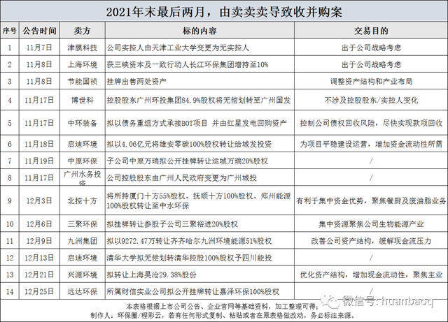 但更多的是,不少我們熟知的上市環(huán)企為了降低負(fù)債、保存實(shí)力“過冬”、緩解資金流動(dòng)壓力,開始“賣賣賣”,小至某個(gè)污水處理廠、垃圾焚燒廠股權(quán)出售,大至整個(gè)公司實(shí)控人發(fā)生變更,年末最后兩月累計(jì)發(fā)生的26起并購(gòu)交易案,其中“賣賣賣”占據(jù)一半,高達(dá)14起。