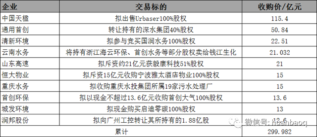 尤其值得一提的是,去年年度TOP 10并購(gòu)案累計(jì)交易規(guī)模高達(dá)300億元,排名前三的,除了業(yè)內(nèi)熟知買來(lái)又賣的中國(guó)天楹出售Urbaser之外,還有兩樁鮮為人知的收購(gòu)大案:通用首創(chuàng)50.84億元轉(zhuǎn)讓40%深水集團(tuán)股權(quán),以及清新環(huán)境作價(jià)22.51億元競(jìng)買國(guó)潤(rùn)水務(wù)。