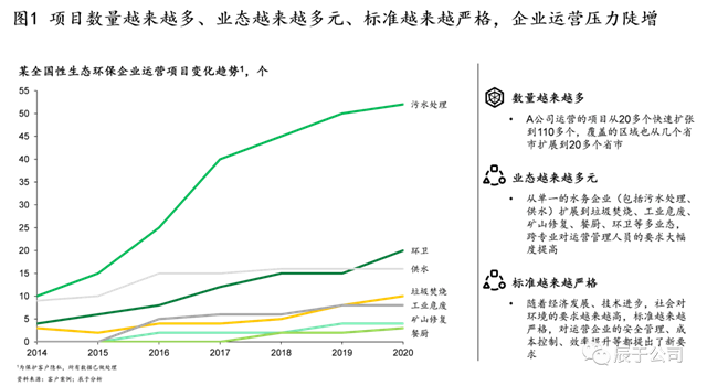 近幾年來,一批環(huán)保企業(yè)蓬勃發(fā)展,規(guī)模迅速擴(kuò)張,他們所持有的項(xiàng)目數(shù)量越來越多,業(yè)態(tài)越來越多元。以我們服務(wù)的某全國性生態(tài)環(huán)保企業(yè)為例,2014-2020年間,運(yùn)營項(xiàng)目從20多個增加到100多個,覆蓋區(qū)域從8個省市擴(kuò)張到20多個,業(yè)態(tài)也從單一的污水、供水,延伸到垃圾焚燒、工業(yè)危廢、礦山修復(fù)、餐廚、環(huán)衛(wèi)等“水、固、生態(tài)修復(fù)”協(xié)同發(fā)展(見圖1)。