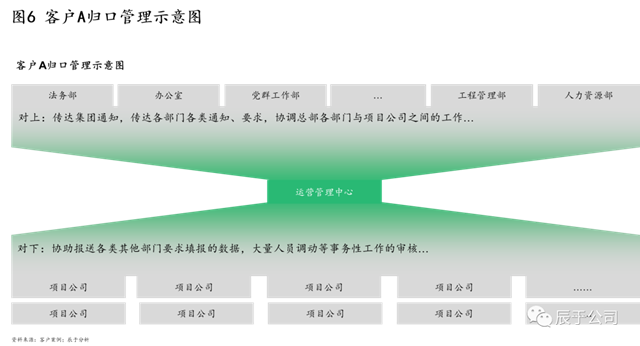 我們也看到,對項(xiàng)目公司的管理,一些企業(yè)簡單的劃分為建設(shè)階段的項(xiàng)目公司由工程管理部門統(tǒng)籌管理、運(yùn)營階段的則由運(yùn)營管理部門統(tǒng)籌管理,對上“傳達(dá)集團(tuán)通知,傳達(dá)各部門各類通知、要求,協(xié)調(diào)總部各部門與項(xiàng)目公司之間的工作”,對下“協(xié)助報送各類其他部門要求填報的數(shù)據(jù),大量人員調(diào)動等事務(wù)性工作的審核”等,原本簡單的總部-項(xiàng)目公司兩級架構(gòu),演變成總部其他部門——總部(工程)運(yùn)營管理部門——(工程期)運(yùn)營期項(xiàng)目公司“漏斗型”三級架構(gòu) (見圖6)。