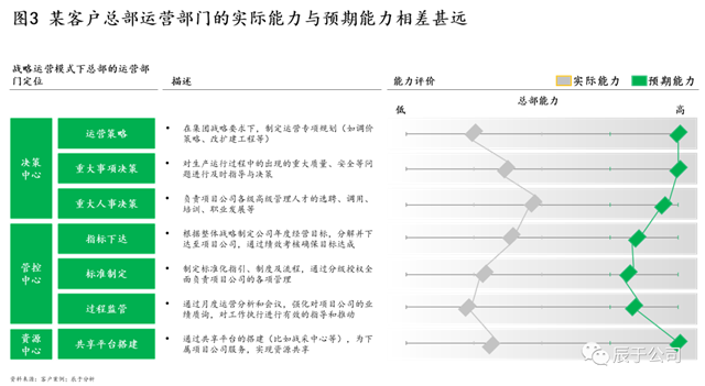 造成以上問題的根本原因是管理沒有跟著業(yè)務(wù)走,各級主體的角色定位沒有跟著公司發(fā)展而變化,該總部管的沒有管好,不需總部管的管太多。領(lǐng)先實(shí)踐表明,隨著一些企業(yè)的業(yè)務(wù)多元發(fā)展,總部定位也需要逐步從運(yùn)營管控往戰(zhàn)略運(yùn)營管控轉(zhuǎn)型,做好“決策、管控、資源共享”等中心定位,但有些企業(yè)的管理變革顯然沒有緊隨其后(見圖3)。