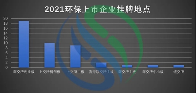 根據(jù)統(tǒng)計(jì)數(shù)據(jù)顯示,43家企業(yè)中,選擇在創(chuàng)業(yè)板上市的企業(yè)有19家,在科創(chuàng)板上市的企業(yè)有10家,在上交所主板上市的企業(yè)有9家,在香港聯(lián)交所主板上市的有2家,在深交所主板上市的有1家,在深交所中小板上市的1家,在紐交所上市1家。從2021年新增環(huán)保上市公司的上市渠道來(lái)看,實(shí)施股票注冊(cè)制的創(chuàng)業(yè)板與科創(chuàng)板已成為優(yōu)選上市板塊。