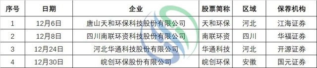 此外,目前還有美埃(中國(guó))環(huán)境科技股份有限公司、華新綠源環(huán)保股份有限公司、湖南軍信環(huán)保股份有限公司、浙江天地環(huán)??萍脊煞萦邢薰?、江蘇環(huán)保產(chǎn)業(yè)技術(shù)研究院股份公司、渤瑞環(huán)保股份有限公司等企業(yè)正在上市路上。