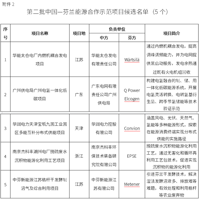 2. 第二批中國—芬蘭能源合作示范項(xiàng)目候選名單(5個(gè))