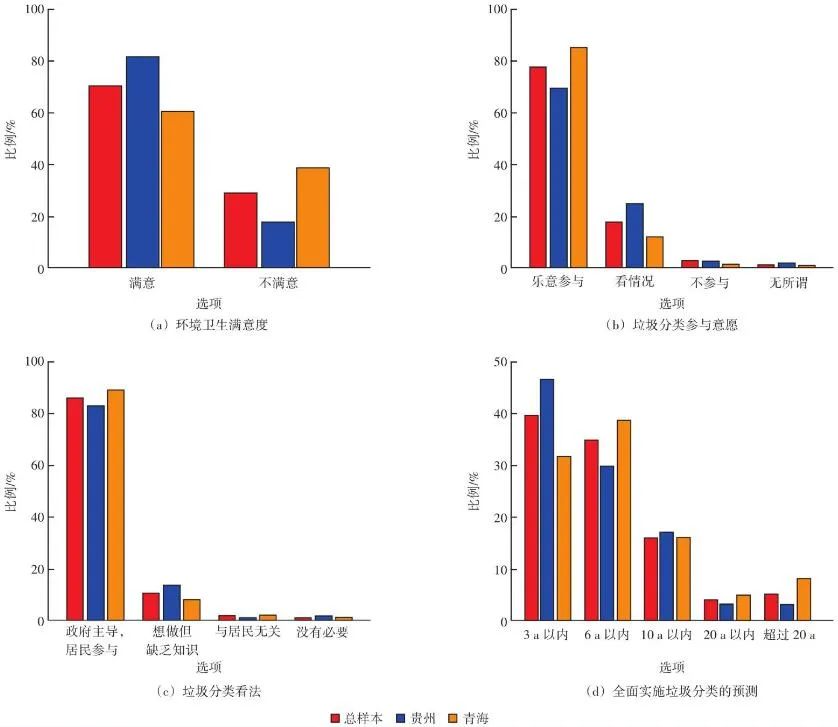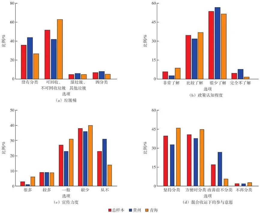 基于青海和貴州兩地的調查數據(共302份有效問卷),分析西部地區(qū)居民垃圾分類意愿及影響因素,發(fā)現環(huán)境衛(wèi)生滿意度為72%。78%的受訪者愿意參與分類,86%的受訪者支持“政府主導,居民參與”,強制分類(72%)、濕垃圾破袋投放(68%)和定時定點投放(61%)3項措施的接受程度較高。分類不方便、設施不完善、宣傳力度不足、缺乏社會氛圍是阻礙居民垃圾分類的主要因素。建議構建政府主導、多方參與的垃圾治理機制,提高垃圾桶配置率和覆蓋率,提高垃圾分類投放的便利性,采取針對性的宣傳策略,營造全民參與垃圾分類的社會氛圍。在采取多樣化的管理措施組合方式下,青海、貴州兩地分別側重加強強制型管理和引導型管理。