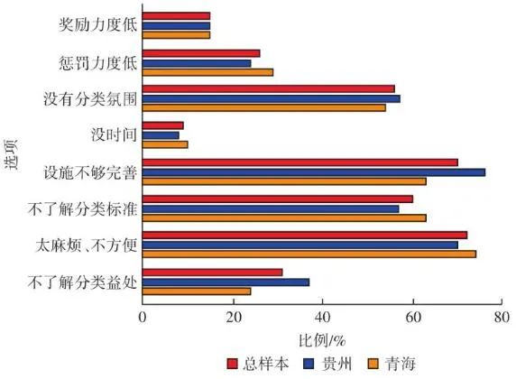 圖 4 實施垃圾分類的困難分析 完善配套設施是居民實施垃圾分類的硬件基礎,但其所發(fā)揮的實際效果很大程度上取決于主觀因素,受政策宣傳的影響較大。調查對垃圾分類政策的了解情況,結果如圖4(b)所示,其選項包括“非常了解”“比較了解”“很少了解”和“完全不了解”,選擇率分別為6%、34%、55%、5%。60%的受訪者對相關政策的了解不充分,“非常了解”的受訪者不足一成,政策認知水平較低。與青海樣本相比,政策認知程度低的問題在貴州樣本中更突出[Sig.(雙側)<0.05]。