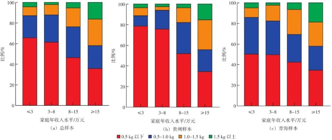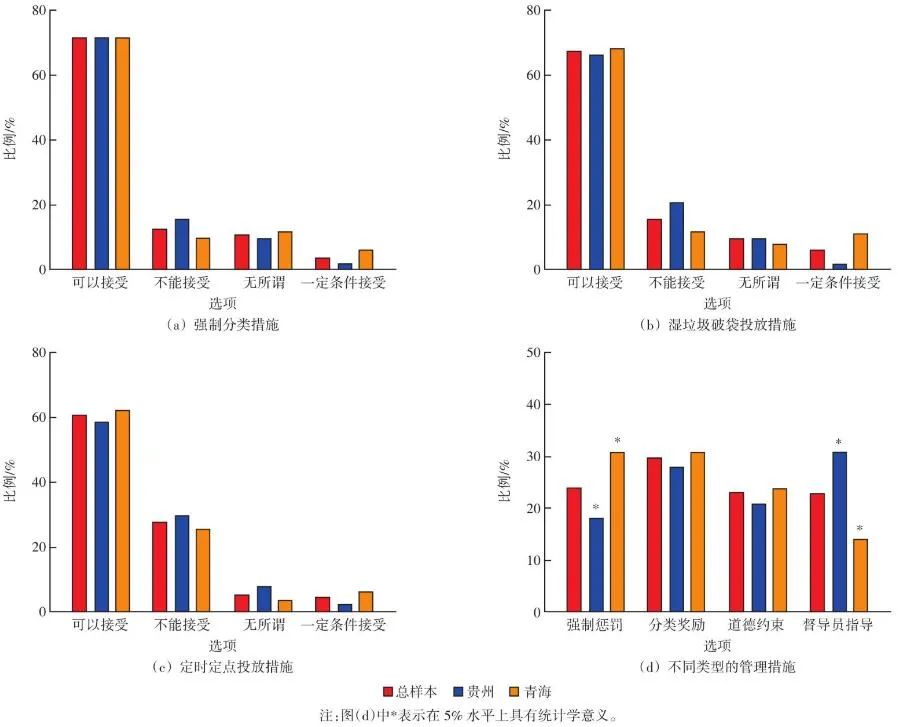 不同地區(qū)在垃圾分類管理模式的選擇上應有所側重。以卡方檢驗分析兩地受訪者對管理模式的選擇差異,見圖5(d),兩地樣本在“分類獎勵”和“道德約束”兩項的選擇差異不顯著,而“強制懲罰”和“督導員指導”兩項的選擇存在顯著差異,因此強制型和引導型管理的側重更值得關注。青海居民更傾向于選擇“強制懲罰”(P<0.05),可能因為青海的環(huán)境衛(wèi)生壓力和居民參與意愿相對較高。同時選擇“懲罰力度較低”的比例相對較高(圖3),當地懲罰力度不足問題可能更突出,建議青海相對側重加強強制型管理。貴州居民更傾向于選擇“督導員指導”(P<0.05),貴州居民參與意愿和政策認識水平相對較低,可能更需要督導員的專門指導,建議貴州相對側重加強引導型管理。