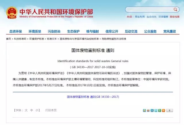 因此,為了統(tǒng)一各個(gè)檢驗(yàn)機(jī)構(gòu)或鑒別機(jī)構(gòu)鑒別固體廢物的尺度,保證鑒別質(zhì)量和鑒別結(jié)果的公正和可靠,環(huán)境保護(hù)部與國家質(zhì)量監(jiān)督檢驗(yàn)總局聯(lián)合發(fā)布《固體廢物鑒別標(biāo)準(zhǔn)  通則》(GB 34330-2017)。該標(biāo)準(zhǔn)是我國首次制定的關(guān)于固體廢物的鑒別標(biāo)準(zhǔn),具有強(qiáng)制執(zhí)行的效力。