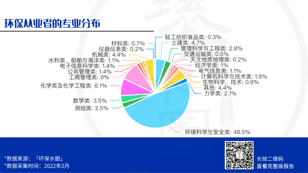 我們發(fā)現(xiàn),當(dāng)前環(huán)保行業(yè)從業(yè)者主要由環(huán)境科學(xué)與安全類、工商管理類、化學(xué)類及化學(xué)工程類、土建類、機(jī)械類這5個專業(yè)畢業(yè),占比分別為48.5%、9%、8.1%、4.7%、4.4%。