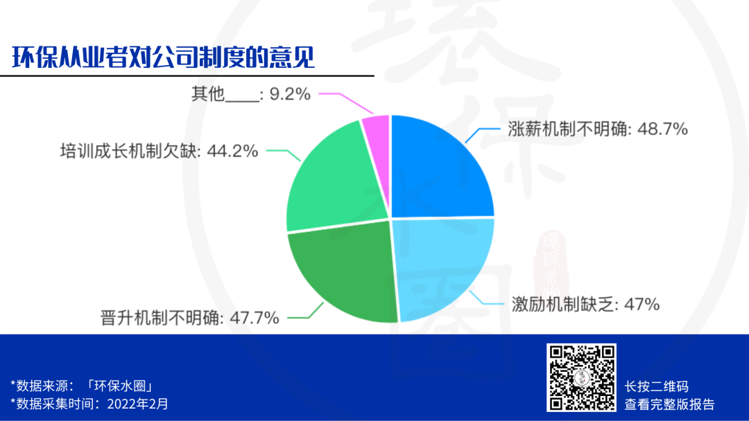 從數(shù)據(jù)中我們還可以看到,有23.8%的環(huán)保人工作在國企,有14.9%的環(huán)保人工作在中外合資或外商獨(dú)資的企業(yè)中,整體占比并不高。