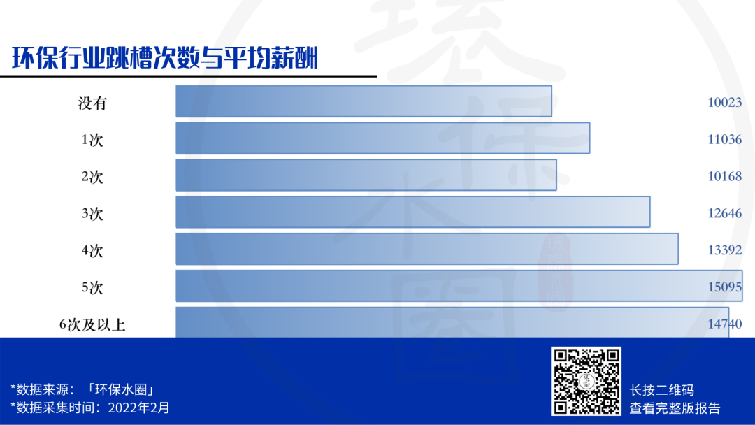 從調(diào)查結(jié)果中可以看到,跳槽經(jīng)歷在3-5次,環(huán)保人的平均薪酬都會有不同幅度的增加。但跳槽頻率不能與次數(shù)劃等號,往往工作三年是一個分水嶺,高頻率的跳槽不僅對薪資增幅毫不幫助,還會影響個人能力的提升和經(jīng)驗(yàn)的積累。