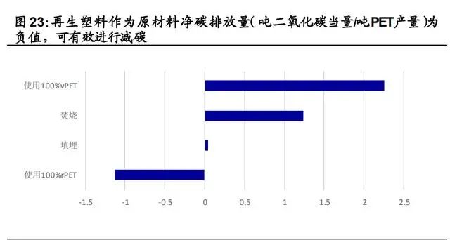 從能耗及碳排放的角度來說,再生塑料比起原生塑料來說顯著的節(jié)能減碳。以 PE 為例:1)每噸再生 PET 可減碳 1.13 噸。美國環(huán)保署(US EPA)對比了焚燒、填埋以及回收 PET 的全生命周期凈碳排 放量,回收再利用是三種終端處理方式中唯一可進(jìn)行減碳的模式。美國 EPA 將使用 100%vPET 以及使用 100%rPET 作為原材料的產(chǎn) 品進(jìn)行對比,認(rèn)為利用 rPET 作為原材料可以有效減少化石原料使 用,每噸再生 PET 可減少 1.13 噸二氧化碳當(dāng)量排放。2)再生塑料 有效減碳創(chuàng)造新的工藝需求。根據(jù)百事亞洲研發(fā)中心,我國 2019 年 PET 瓶消耗量為 442 萬噸,假定保持 94%的高回收率,經(jīng) 4 次循環(huán), PET 瓶可每年抵減 2427 萬噸二氧化碳當(dāng)量排放。PET 瓶到瓶再生 利用可助力我國實(shí)現(xiàn)碳中和政策。