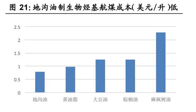 國際政策推動(dòng)國內(nèi)地溝油利用“高端化”:1)車用油“烴基化”趨勢明顯。未來伴隨歐洲對于添加比例、排放標(biāo)準(zhǔn)等約束趨嚴(yán),車用油面臨“烴基化”趨勢,生物柴油將向著可再生柴油方向升級。2) 國際航協(xié) 2050碳中和目標(biāo)推動(dòng)生物質(zhì)烴基航煤需求釋放。國際航協(xié)設(shè)立2050年實(shí)現(xiàn)碳中和的強(qiáng)制性目標(biāo),生物質(zhì)航煤作為主要減 排手段需求量將攀升。①作為高排放行業(yè)之一,2019年航空業(yè)占全 球碳排放量的 2%。②國際航協(xié)(IATA)于 2021 年 10 月通過決議, 290 個(gè)成員航司在 2050 年實(shí)現(xiàn)碳中和,助力實(shí)現(xiàn)巴黎協(xié)定控制溫升 的目標(biāo)。計(jì)劃減排量相當(dāng)于 2050 年前累計(jì)減排 212 億噸二氧化碳 當(dāng)量。③現(xiàn)有技術(shù)中,生物質(zhì)航煤為主的環(huán)保航空燃料將為主要的 減排手段,環(huán)保燃料預(yù)計(jì)貢獻(xiàn) 65%碳減排量。IATA 初步目標(biāo)為, 2025 年環(huán)保航空燃料產(chǎn)量由 2019 年的 1.4 億升提升至 79 億升, IEA 測算全球生物質(zhì)航煤的產(chǎn)量在 2021 至 2026CAGR77%。