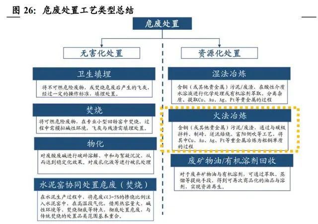 危廢資源化回收金屬主要有火法和濕法工藝。1)危廢資源化回收金屬主 要針對 HW22(含銅廢物)、HW17(表面處理廢物)、HW46(含鎳廢物) 和 HW48(有色金屬冶煉廢物)等。2)濕法工藝產(chǎn)品為金屬鹽(例如硫 酸銅、氧化銅、堿式氯化銅、硫酸鎳、碳酸鎳和硫化鎳),火法工藝產(chǎn)品 為再生金屬(例如含銅量在 97%的粗銅)。