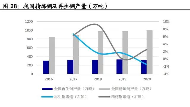 對標(biāo)發(fā)達(dá)國家,我國再生金屬利用率有待提升。同樣以火法資源化 典型產(chǎn)品再生銅為例,1)2021年我國精煉銅產(chǎn)量同比增長 7%達(dá) 1049 萬噸,根據(jù) SMM,2021 年用于生產(chǎn)電解銅的再生銅原料占比 約為 21%,與發(fā)達(dá)國家平均 64%的比例相比仍差距較大(WBMS, 2016)。2)根據(jù)《“十四五”循環(huán)經(jīng)濟(jì)發(fā)展規(guī)劃》,2020 年我國再生 銅產(chǎn)量 325 萬噸,到 2025 年再生銅產(chǎn)量將達(dá) 400 萬噸。3)預(yù)計(jì)未 來碳排放約束將持續(xù)提升我國再生銅利用比例。