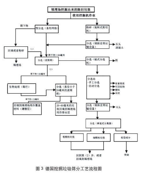德國使用挖掘機(jī)對(duì)3米厚的覆土層的固體垃圾進(jìn)行開采。一般固體垃圾通過孔徑為60毫米的滾筒篩。大件垃圾在放置于滾筒篩上之前被粉碎。在滾筒篩之后,形成了粒度在0到60毫米之間的部分。用滾筒篩進(jìn)一步篩分,產(chǎn)生了粒度在0到20毫米之間的細(xì)顆粒垃圾和粒度在20到60毫米之間的部分。小于20毫米的細(xì)顆粒垃圾回填到填埋場(chǎng),用作覆蓋材料。20到60毫米的部分回填到填埋場(chǎng),用作填埋場(chǎng)的排水層。德國挖掘垃圾篩分工藝見圖3。