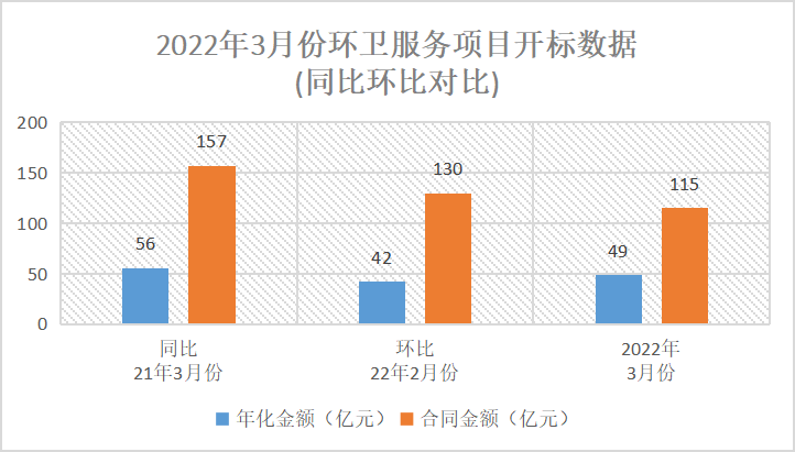 受疫情影響,三月份全國范圍環(huán)衛(wèi)服務(wù)項目大面積暫停招標或推遲開標,與去年同期(同比)及今年二月份(環(huán)比)相比,環(huán)衛(wèi)服務(wù)項目成交年化額及合同額均出現(xiàn)不同程度下降。