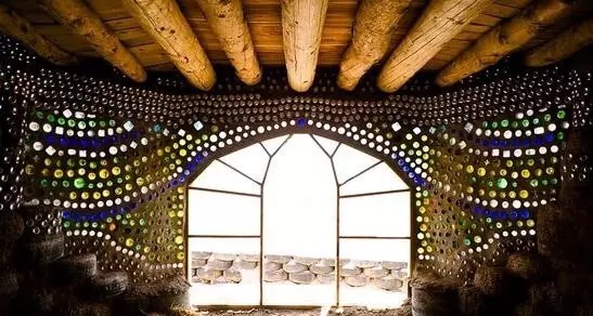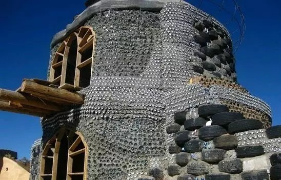 這是美國建筑師麥克·萊諾茲的作品。他的作品外形千奇百怪,而且都遵循著同一種理念:不需任何外接水電排污系統(tǒng),能夠自己發(fā)電,調溫,生產(chǎn)食物,收集循環(huán)用水;基本建材全是垃圾,廢棄輪胎、易拉罐、飲料瓶等。他給它們起了個名字:地球之舟Earthship。圖中的房子用輪胎和瓶子筑成的墻非常厚實,足以抵抗九級地震。