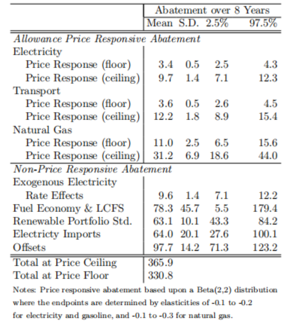 相對于價格因素而言,非市場因素對溫室氣體減排的貢獻較大。表1為2013-2020年減排供給量的估計值,該表下半部分的非市場因素,如清潔發(fā)電計劃、能效提升政策、清潔燃油政策等環(huán)境政策的減排量(Price Non-Responsive Abatement),明顯高于表上半部分的電力、燃油和天然氣等價格因素所產(chǎn)生的減排量(Allowance Price Responsive Abatement)。