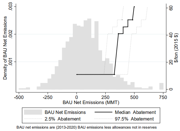 如圖2所示,通過分析減排需求和減排供給的估計值,文章發(fā)現(xiàn)市場出清時,溫室氣體交易的價格有94.8%的概率處于或者接近價格下限即拍賣底價(Auction Reserve Price,ARP)。這意味著相對于估計得到的BAU排放量,排放配額的設(shè)定過高,此時經(jīng)濟主體通過非市場因素的配套政策即可完成溫室氣體減排約束,無需在交易市場上高價購買排放配額。價格處于“內(nèi)部均衡”,即均衡價格高于價格下限ARP但低于價格上限(Allowance Price Containment Reserve,APCR)的概率為1.2%,此時溫室氣體排放的價格彈性較高,配額交易市場的減排有效性達到最優(yōu)狀態(tài)。
