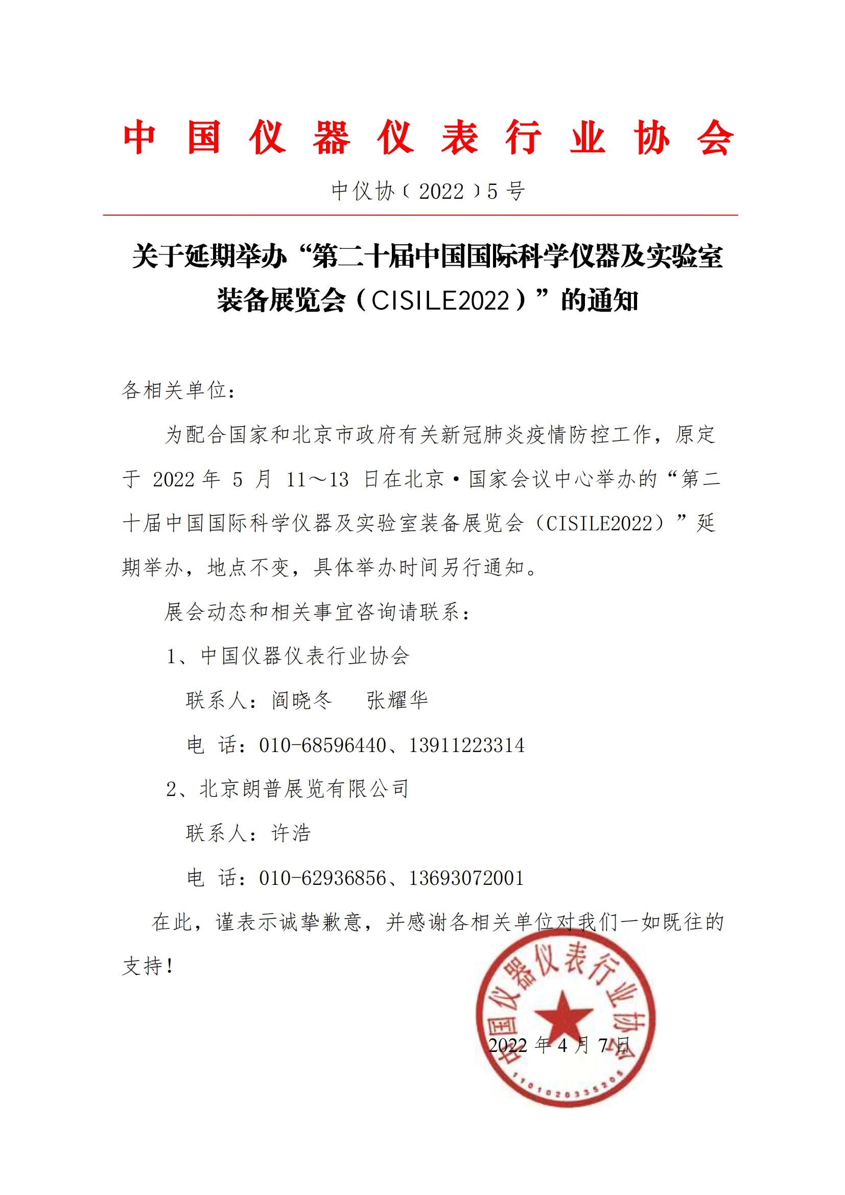 關(guān)于延期舉辦“第二十屆中國(guó)國(guó)際科學(xué)儀器及實(shí)驗(yàn)室裝備展覽會(huì)(CISILE2022)”的通知
