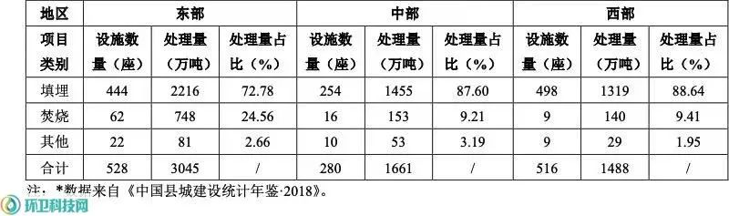 2018年全國縣級行政區(qū)域的無害化處理設(shè)施1324座,其中填埋設(shè)施1196座,2018年