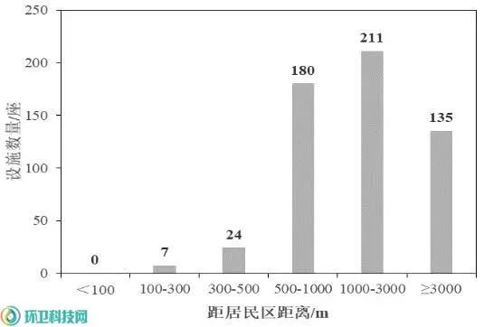 GB16889-2008規(guī)定:生活垃圾填埋場場址的位置及與周圍人群的距離應(yīng)依據(jù)環(huán)境影響評價(jià)結(jié)論確定,并經(jīng)地方環(huán)境保護(hù)行政主管部門批準(zhǔn)。由圖3可知,2010~2015年新建填埋場中,填埋場場址距周邊居民區(qū)小于300米的有7座,300~500米的有24座,二者占有效數(shù)據(jù)(557座)的5.6%;500~1000米的有180座,占有效數(shù)據(jù)的32.5%;而距離大于3000米以上的填埋場僅135座,占有效數(shù)據(jù)的24.2%?,F(xiàn)場調(diào)研情況和統(tǒng)計(jì)分析結(jié)果表明:距居民區(qū)1000米內(nèi)填埋場的惡臭投訴事件近90%,而距居民區(qū)大于3000米填埋場的惡臭投訴事件則幾乎沒有。