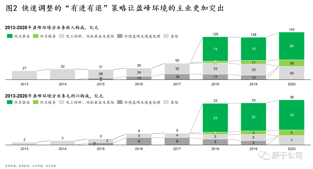 盈峰環(huán)境2015年進入環(huán)保產(chǎn)業(yè),經(jīng)歷過一系列小型并購但毫無起色的彎路之后,2018年開始聚焦環(huán)衛(wèi)行業(yè),當年以152.5億元全資收購中聯(lián)環(huán)境,正式進入環(huán)衛(wèi)裝備及環(huán)衛(wèi)運營一體化服務領(lǐng)域。收購完成后,環(huán)衛(wèi)裝備及環(huán)衛(wèi)服務業(yè)務的占比超過80%,成為公司的核心主業(yè),到2020年收入規(guī)模就達到了143億,幾乎是2017年49億的3倍(見圖2)。